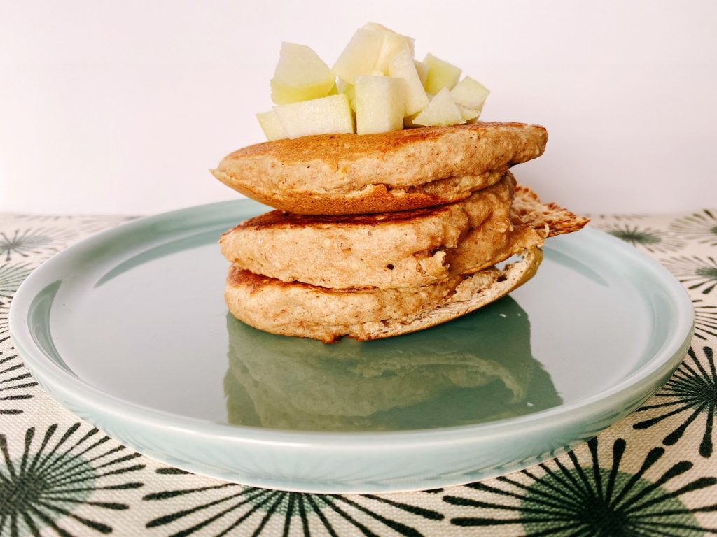 Bij deze vegan pancakes met appelmoes eet ik graag ahornsiroop en stukjes peer. Ook erg lekker: verse blauwe bessen.